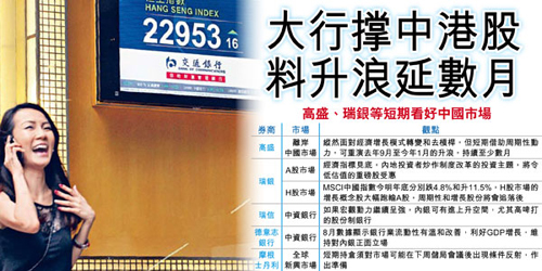 Mỏng mới nhất về sách lược đầu tư cổ phiếu châu Á-Thái Bình Dương của Goldman Sachs nhận định chứng khoán Trung Quốc nói chung và chứng khoán Hong Kong nói chung có thể tái diễn kịch bản tăng trong vài tháng vốn diễn ra từ tháng 9/2012 tới tháng 1/2013. Nguồn: Internet Giải pháp chính trị tháo ngòi nổ chiến tranh Syria bất thần xuất hiện gần như xóa tan nỗi ám ảnh về một cuộc can thiệp vũ trang kéo theo nhiều hậu quả khôn lường, sự thăng hoa đã xuất hiện trên thị trường chứng khoán Hong Kong với nhiều phiên tăng điểm liên tục.